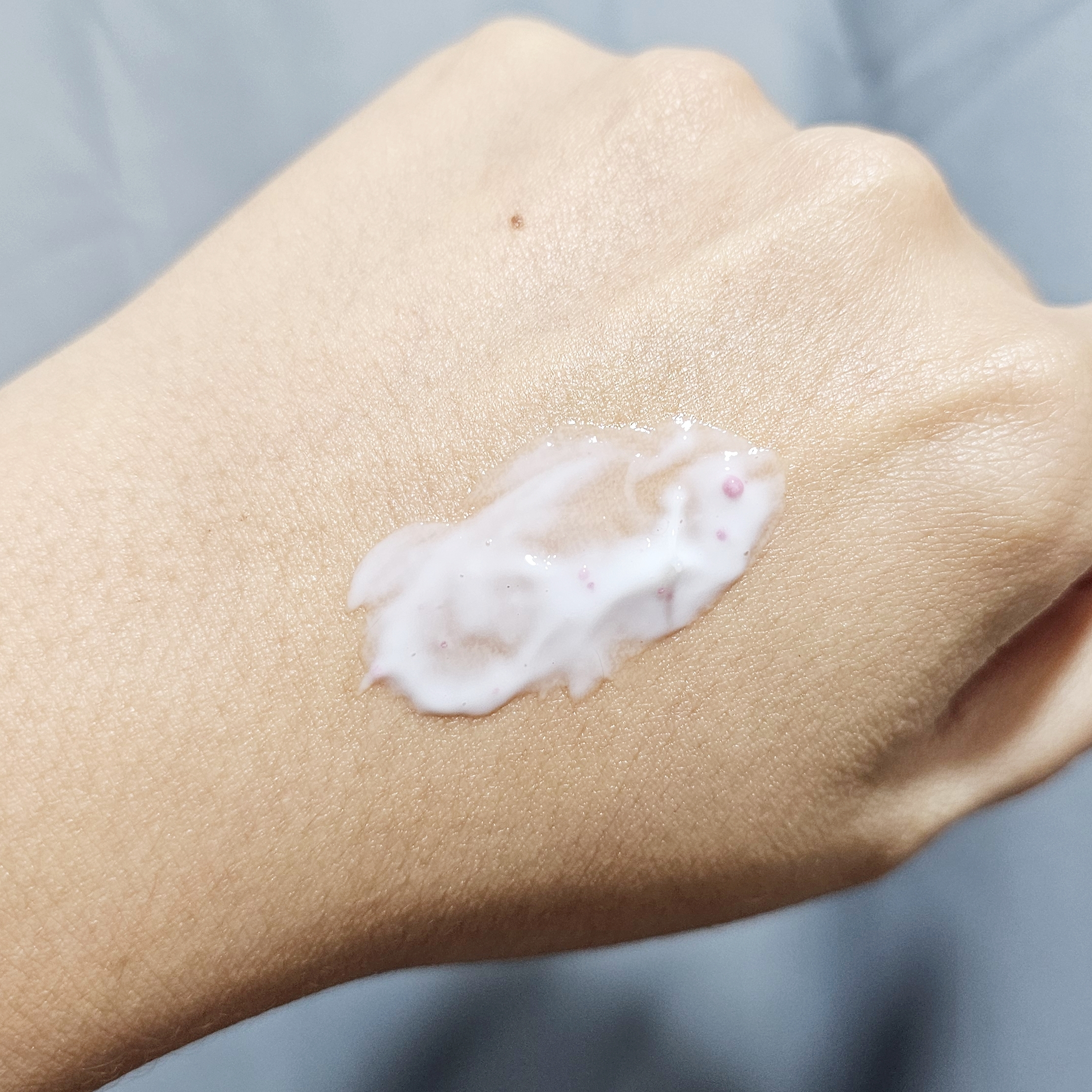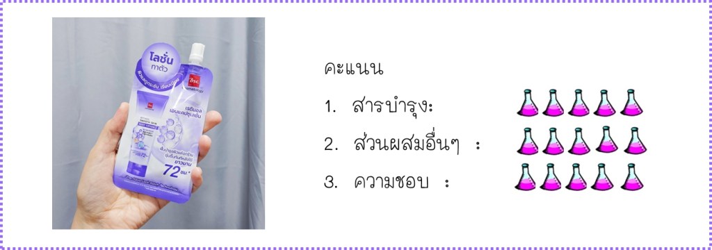 เนื้อโลชั่นบางเบา มีเม็ดบีดส์สีม่วงกระจายอยู่ พยายามจะเกลี่ยให้เห็นเม็ดบีดส์