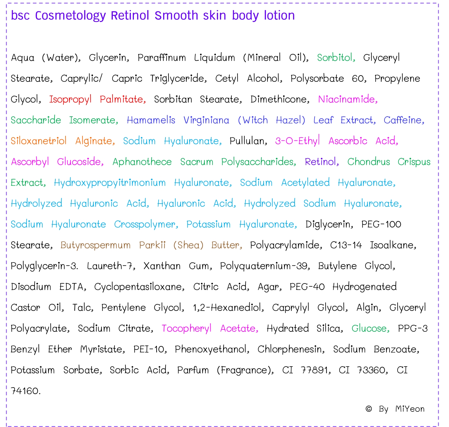 - ส่วนผสมอื่นๆ ไม่มีสารที่ไม่เป็นมิตรกับผิว แม้จะมี Isopropyl palmitate แต่การใช้ในเบสเรตินอล แล้วใช้กับผิวกาย คิดว่าไม่น่ากังวล ให้ไป 5 ฟลาสก์
