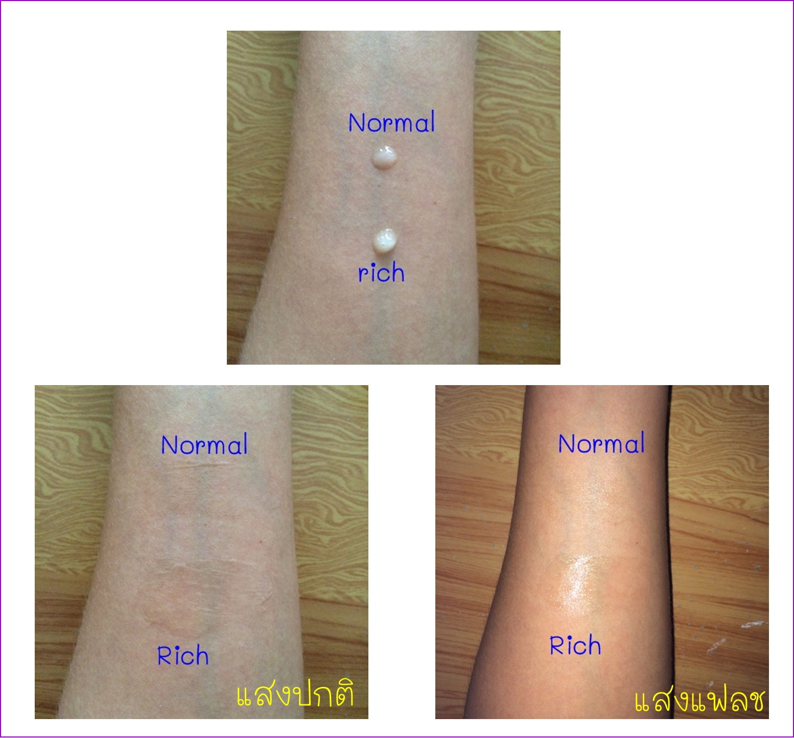 ถ้าเป็นสูตร Rich เนื้อจะดูหนักกว่า ดูมีเนื้อมีน้ำมีนวลขึ้นมานิดหน่อยค่ะ ไม่ได้ใส่น้ำหอมเช่นกัน ก็จะมีกลิ่นบางๆของส่วนผสมเช่นกับสูตรปกติค่ะ