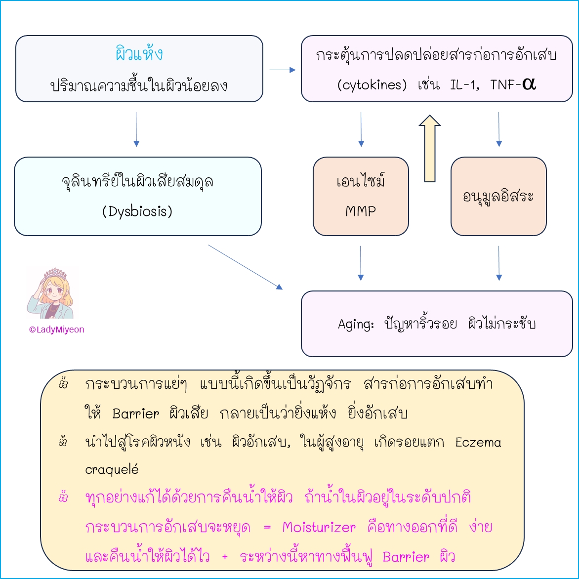 เมื่อความชุ่มชื้นของผิวดรอปลงจนถึงค่าๆ หนึ่ง บางข้อมูลก็ว่า น้ำในผิวน้อยกว่าระดับ 30 AU วัดจากค่าของเครื่อง corneometer บาง ref ก็บอกว่า น้อยกว่า 10 – 15% บาง ref ก็เมนชั่นถึงค่าการระเหยของน้ำจากผิว (Trans-epidermal water loss; TEWL) สูงกว่า 15 – 25 g/m2/h มันจะส่งสัญญาณไปกระตุ้นให้เกิดการปลดปล่อยสาร Cytokines พวกที่อาจก่อให้เกิดกระบวนการอักเสบ เช่น IL-1 ซึ่งถ้ามีน้อยๆ มันเป็นเรื่องดี มันจะไปกระตุ้นให้ผิวเราฟื้นตัว เสริมการสร้าง Barrier ปรับสมดุลกระบวนการสร้าง-เจริญของหนังกำพร้า แต่ถ้ามีมากไป หรือมีออกมาไม่หยุด มันจะทำให้เกิดการอักเสบ ที่ส่งผลต่อให้มีอนุมูลอิสระ มีการกระตุ้นเอนไซม์ MMP มาย่อยคอลลาเจน แล้วก็วนไปวนมาแบบนี้ค่ะ ทำให้กลายเป็นวงจรแบบว่ายิ่งแห้งยิ่งแย่ และทำให้ระบบสมดุลไมโครไบโอมเสียไป มีผู้เสนอคอนเซปท์เรื่อง Dry skin cycle ไว้อยู่ด้วยค่ะ