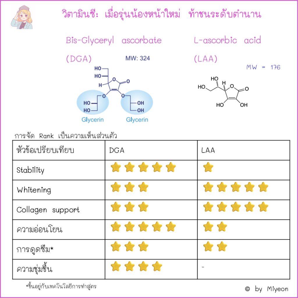 ในภาพรวมถือว่าเป็น vitamin C ฟอร์มที่น่าสนใจ และค่อนข้างใหม่ ถ้าถามว่าจะเลือกอันไหนดีระหว่าง L-ascorbic acid (LAA) กับ Bis-Glyceryl ascorbate (DGA) ต้องบอกว่า เลือกยากน่าดู เพราะตัวหนึ่งก็เป็นตำนาน อีกตัวก็พัฒนามาแก้เกมและข้อจำกัดของรุ่นพี่ที่เป็นตำนาน แล้วทำได้ดีด้วยสิ