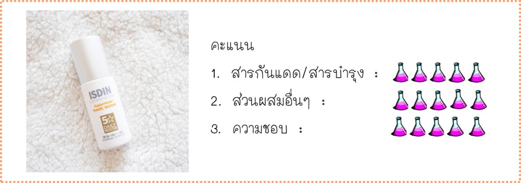 - ความชอบ ปกติพอเราพูดถึงกันแดดที่กัน UV ฉ่ำๆ เรามักจะต้องแลกด้วยความเหนอะหนะของเบส แต่ตัวนี้ทำมาได้ดี โดยไม่ต้องใช้ซิลิโคนและแอลกอฮอล์ รวมทั้งผ่านการทดสอบความเป็นมิตรต่อสิ่งมีชีวิตในท้องทะเล ในด้านเนื้อสัมผัสคือดีเลิศ น่าจะเหมาะกับทุกสภาพผิว โดยเฉพาะ คนผิวมัน ผิวเป็นสิวง่าย แต่คนผิวแห้งก็ยังสามารถใช้ได้ โดยให้ทาสกินแคร์ให้เรียบร้อยก่อน ส่วนตัวมีผิวผสม-แห้ง ก็ไม่ได้รู้สึกว่าจะแห้งมากขึ้นในช่วงบ่าย ตอนทาก็จะมีกลิ่นหอมอ่อนๆ โดยรวมก็คือชอบมาก ให้ไป 5 ฟลาสก์