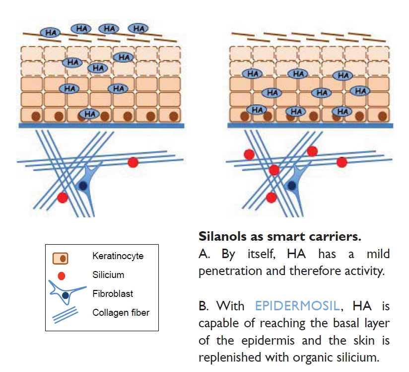 สำหรับสูตรผสมของ Silanetriol กับ Hyaluronic acid นั้นมีชื่อทางการค้าว่า Epidermosil ซึ่งเอา Silanetriol มาเป็นระบบนำส่งให้ Hyaluronic acid เข้าผิวได้ดีขึ้นค่ะ