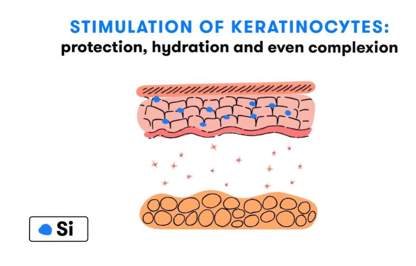 Silicon กระตุ้นการทำงานของเซลล์ผิวในชั้นหนังกำพร้า (Keratinocyte) ช่วยปกป้อง เสริมการอุ้มน้ำ และช่วยให้สีผิวสม่ำเสมอ