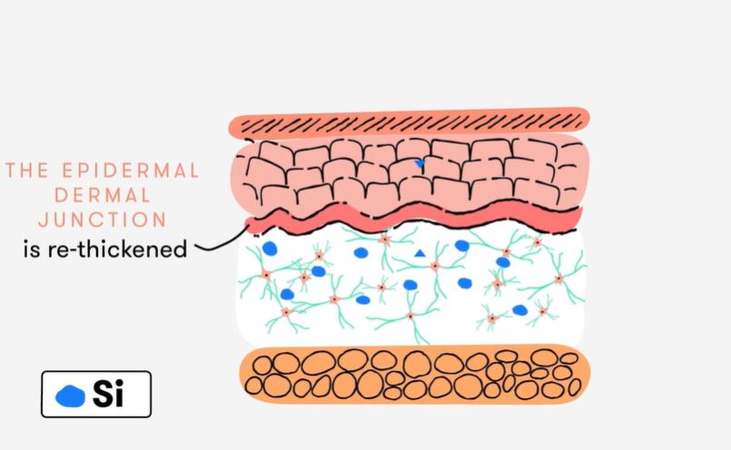 ระหว่างชั้นหนังกำพร้า กับหนังแท้ มันจะมีโครงสร้างที่เรียกว่า Dermal-Epidermal Junction หรือ DEJ ซึ่งสำคัญมาก เพราะจะพยุงเอาโครงสร้างผิวเอาไว้ พอเราอายุเพิ่มขึ้น DEJ จะยุบ แล้วทำให้เกิดริ้วรอยร่องลึกขึ้นมา