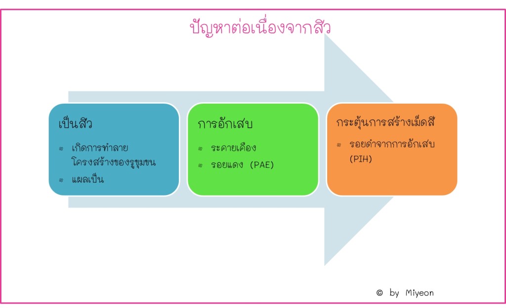 ปัญหาสิวยังไม่จบแค่สิวมันโผล่มา แต่พอสิวหายก็ยังทิ้งปัญหาต่อเนื่องไม่จบไม่สิ้น ไม่ว่าจะเป็นรอยแดง (เรียก Post-acne erythema; PAE) รอยดำจากการอักเสบ (Post-inflammatory hyperpigmentation; PIH) รวมไปถึงอาจจะเกิดรอยแผลเป็น ถ้าตอนเป็นสิวนั้นเป็นมากจนเกิดการทำลายโครงสร้างของรูขุมขนไป