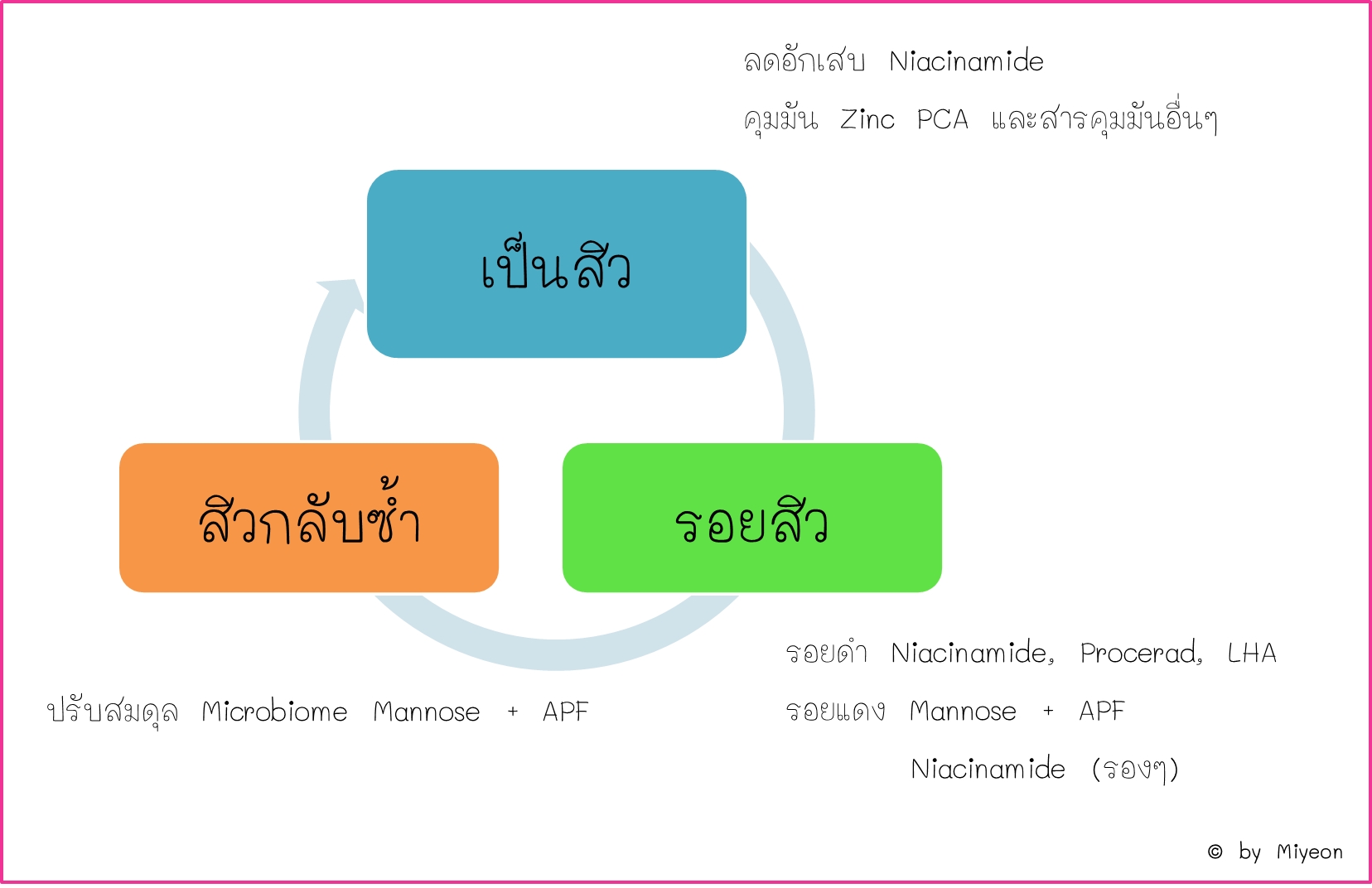 ในภาพรวมส่วนผสมที่ทางแบรนด์เลือกใช้สามารถดูแลปัญหาสิวและปัญหากวนใจที่มากับสิวได้ครบจบทุกวงจรของการเกิดสิว ซึ่งสามารถสรุปได้ดังภาพ