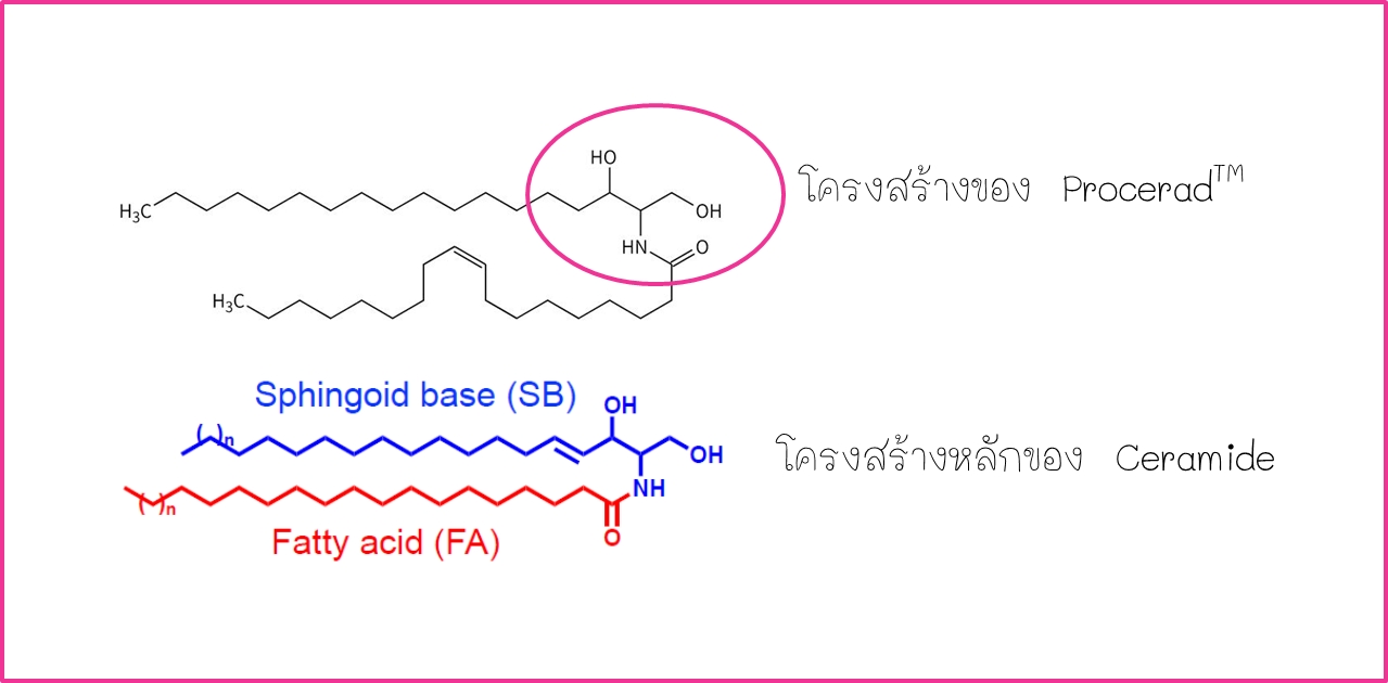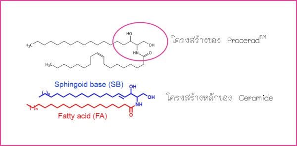 เทียบโครงสร้างของ Procerad กับ แกนโครงสร้างหลักของ Ceramide จะเห็นว่ามีส่วนหัวที่เหมือนกัน