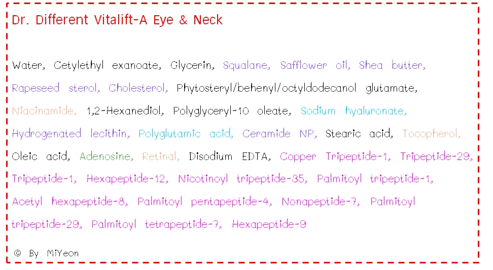- Double peptide complex ที่เบลนด์ Acetyl hexapeptide-8 ที่ให้ผลคลายริ้วรอยชั่วคราว ร่วมกับ Palmitoyl pentapeptide-4 ที่เสริมสร้างการผลิตคอลลาเจนและเส้นใยใน dermis ให้ผิวกระชับ ยืดหยุ่น ไม่หย่อนคล้อย เมื่อใช้ร่วมกัน ในทางทฤษฎีก็จะช่วยคลายริ้วรอยชั่วคราวในระยะสั้น และค่อยๆ ซัพพอร์ตการสร้างเส้นใยออกมาในระยะยาว