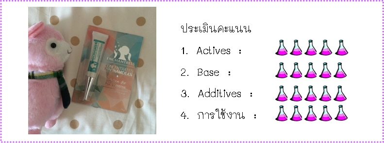 - Additives สารปรุงแต่งอื่นๆ มีเพียงสารเพิ่มความหนืด น้ำหอม และสารกันเสีย เท่านั้น ซึ่งถือว่าเลือกใส่มาเท่าที่จำเป็น ไม่มี Parabens ไม่มี Silicone และไม่มี Surfactant ใดๆ จึงไม่มีจุดให้หักคะแนน ได้ไป 5 ฟลาสก์