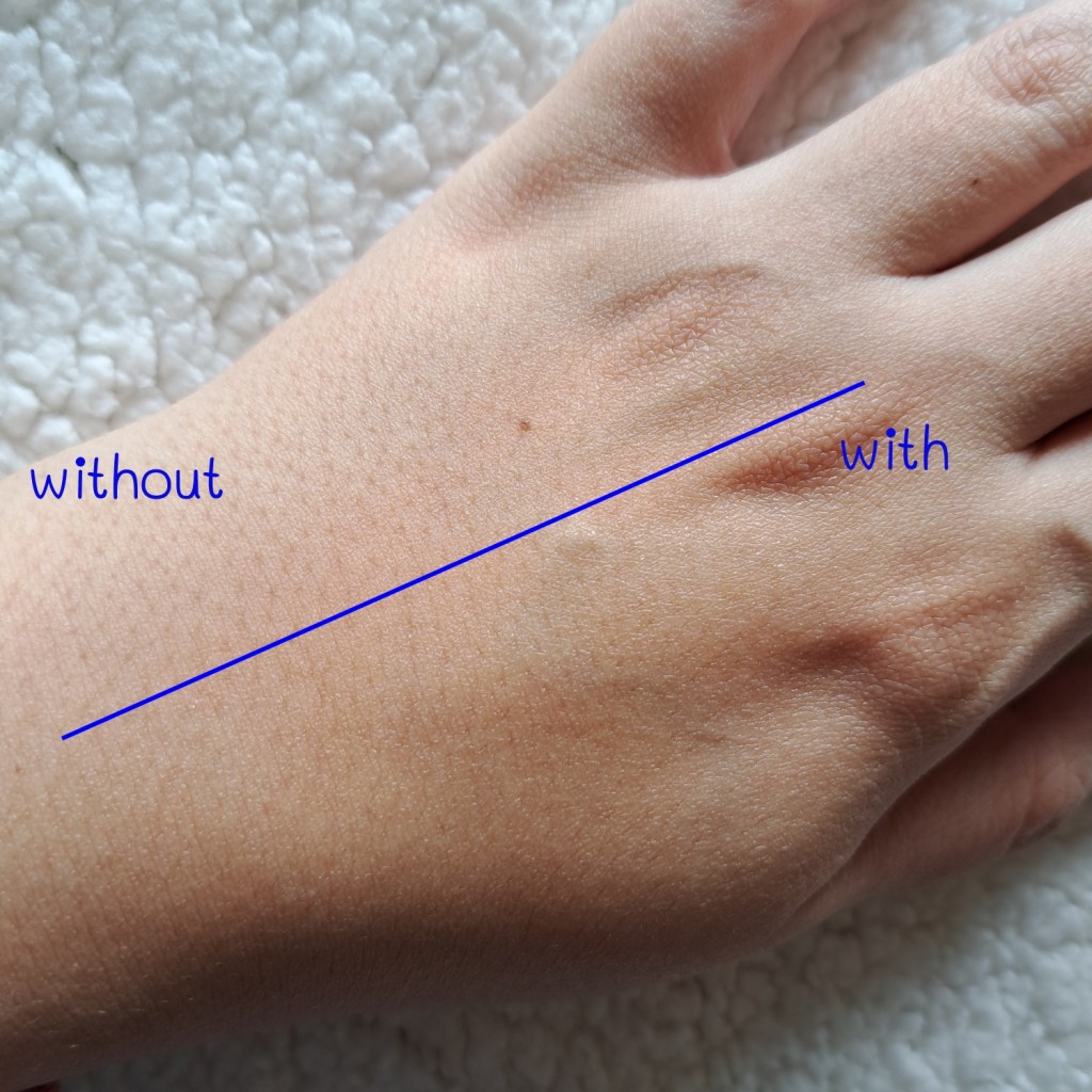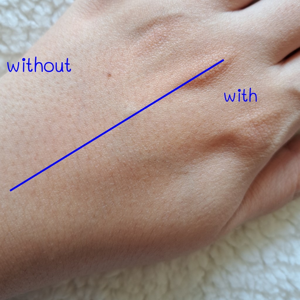 เมื่อถ่ายด้วยแสงแฟลชจะเห็นว่ามีลักษณะวาวๆ คล้ายฟิล์มของเนื้อกันแดดอยู่