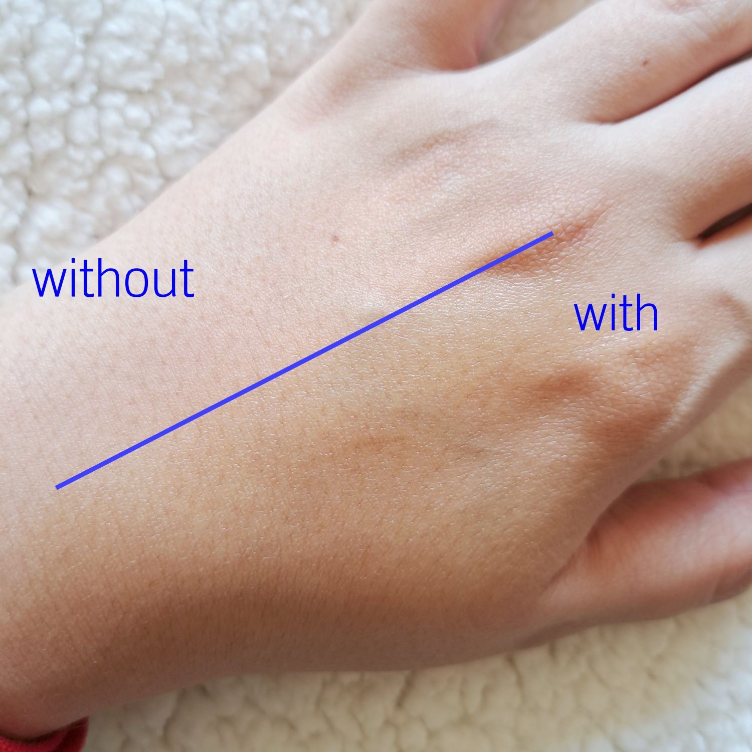 เมื่อถ่ายด้วยแสงแฟลชจะเห็นว่ามีลักษณะวาวๆ คล้ายฟิล์มของเนื้อกันแดดอยู่