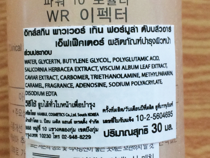 จากส่วนผสมจะเห็นว่ามีสารสกัดและสารออกฤทธิ์ที่เป็น antioxidant ดีๆอย่าง Superoxide dismutase กับชาเขียว แม้ว่าจะไม่รู้ว่ามันจะออกฤทธิ์ได้จริงหรือเปล่า เพราะมันเป็นกลุ่ม Enzyme ซึ่งความคงตัวค่อนข้างต่ำ สูตรนี้มีน้ำมันด้วย แต่ไม่มากนัก ไม่มีแอลกฮอล์ จึงน่าจะใช้ได้กับทุกสภาพผิว