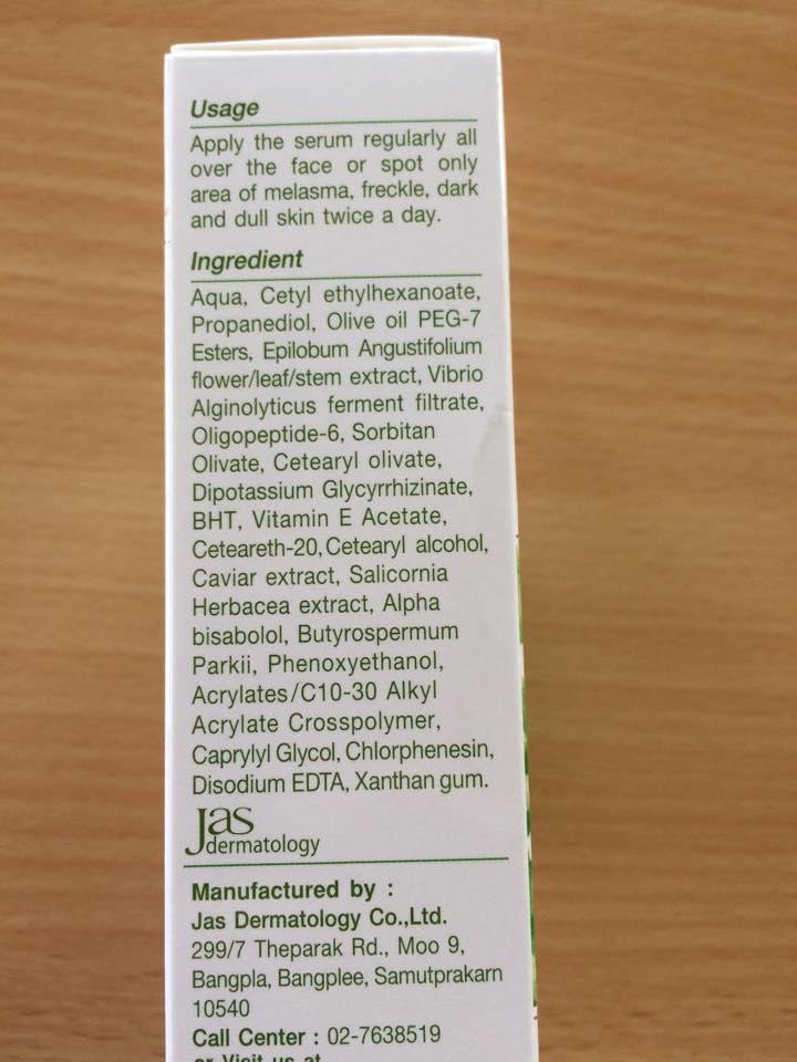 โดยรวมแล้วสารที่ใส่มาให้ผลเกี่ยวกับเรื่องการอักเสบในผิว มีสารช่วยให้ผิวแข็งแรง ชุ่มชื้น และก็มีไวท์เทนนิ่งอยู่ แม้จะยังคลุมเคลืออยู่บ้าง เรื่องการเขียนส่วนผสม โดยเฉพาะเรื่องน้ำหอม เพราะตอนทาจะมีกลิ่นอ่อนๆอยู่ ไม่แน่ว่าจะเป็นน้ำหอมหรือกลิ่นวัตถุดิบ