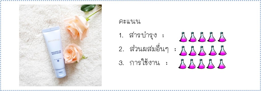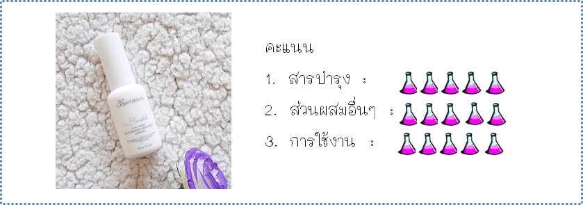 - สารบำรุง ในภาพรวม จะเป็นมอยส์เจอไรเซอร์ฟื้นฟูความแข็งแรงของ Barrier ผิวด้วยเทคโนโลยี MLE ดูแลการระคายเคือง ด้วย RestomideTM พร้อมทั้งปรับสมดุลการสร้าง-เจริญ-ผลัดทิ้งของเซลล์ในชั้นหนังกำพร้า ซึ่งน่าจะให้ประโยชน์ในการปรับสมดุลลดการอุดตันผิว เนื้อมาแบบบางเบา ไม่เหนอะหนะ จึงเหมาะกับคนผิวมันและมีแนวโน้มเป็นสิวง่าย ถ้ามองเรื่องเสริมชั้นผิวสำหรับคนผิวมัน นี่ว่าโอเคนะ ให้ไป 5 ฟลาสก์