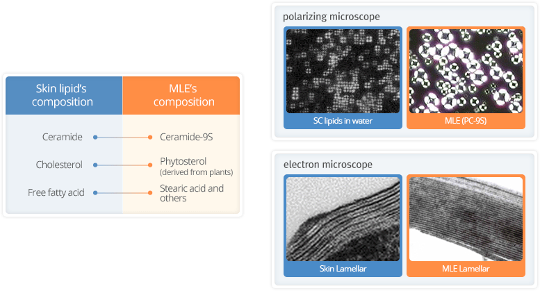 - เจ้า MLETM นี่เป็นสูตรผสมของ Pseudoceramide (Myristoyl/palmitoyl oxostearamide/arachamide MEA หรือ Ceramide-9S) ร่วมกับ Phytosterol และกรดไขมัน Stearic acid เรียงตัวในรูปแบบที่คล้ายกับ Liquid crystal ของผิว เมื่อดูด้วยกล้องจุลทรรศน์ชนิด Polarized light จะเห็นเป็นเครื่องหมายกากบาท เรียก Maltese cross