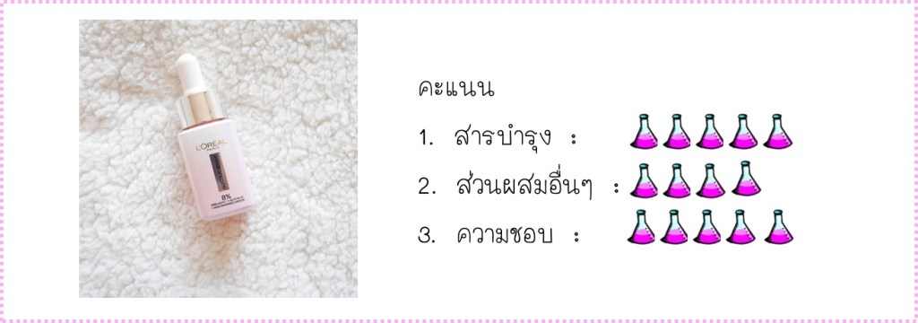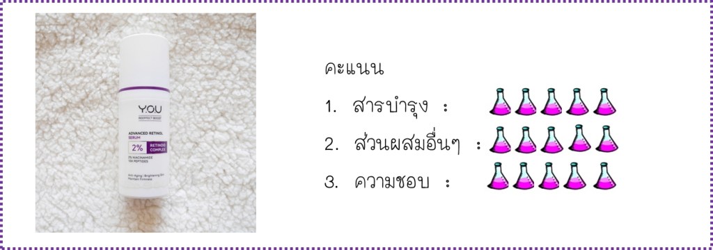 - ความชอบ ตัวเซรั่มมาในเนื้อที่บางเบาไม่หนักมาก เลเยอร์ลงรูทีนง่าย ในด้านของความชุ่มชื้น สำหรับคนผิวผสม-แห้ง อาจจะต้องมีครีมมาทับอีกชั้น ในด้านของการใช้งานส่วนตัวมองว่าเซรั่มนี้ทำมาได้ค่อนข้างดี ผิวนุ่มเนียนขึ้น และเป็นทางเลือกที่น่าสนใจสำหรับการใช้เซรั่มที่ไม่มีเรตินอยด์ ให้ไป 5 ฟลาสก์