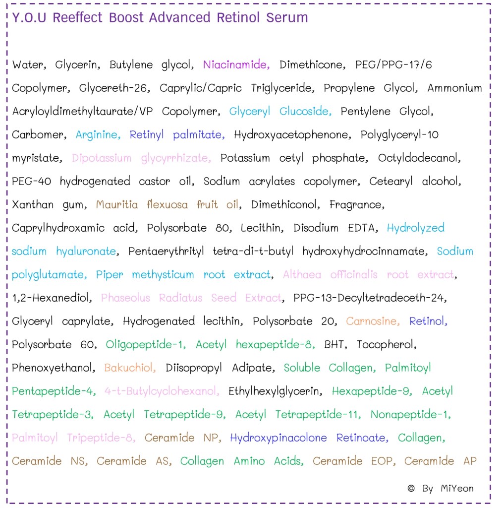 - Double peptide complex ที่เบลนด์ Acetyl hexapeptide-8 ที่ให้ผลคลายริ้วรอยชั่วคราว ร่วมกับ Palmitoyl pentapeptide-4 ที่เสริมสร้างการผลิตคอลลาเจนและเส้นใยใน dermis ให้ผิวกระชับ ยืดหยุ่น ไม่หย่อนคล้อย เมื่อใช้ร่วมกัน ในทางทฤษฎีก็จะช่วยคลายริ้วรอยชั่วคราวในระยะสั้น และค่อยๆ ซัพพอร์ตการสร้างเส้นใยออกมาในระยะยาว