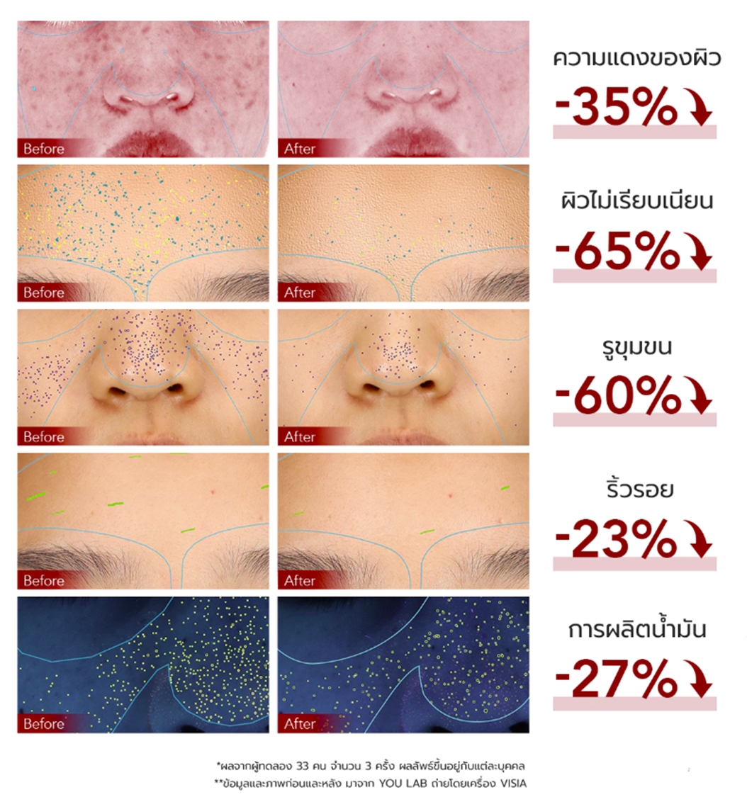 ผลเทสต์ในอาสาสมัครพบว่า ผิวมีความกระชับขึ้น และมีริ้วรอยลดเลือนลง
