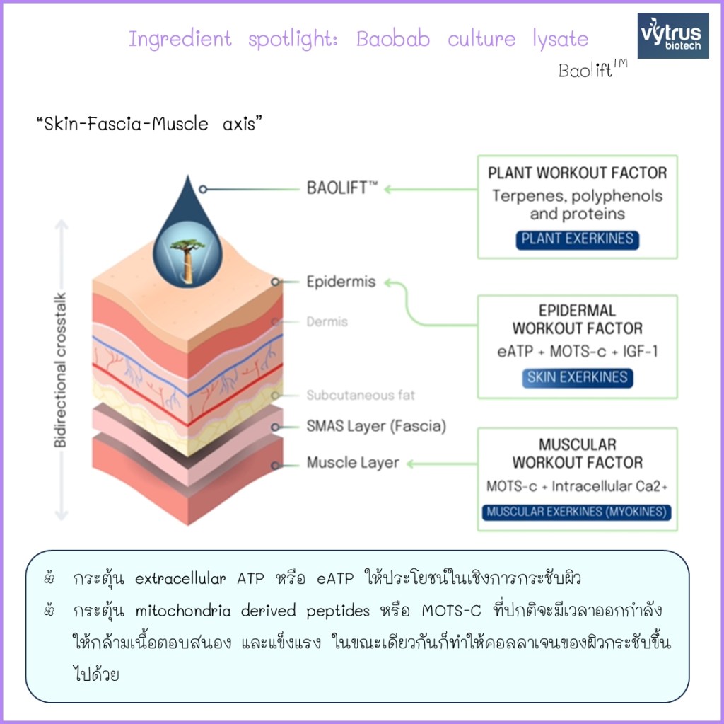 - Adansonia digitata callus culture lysate (2%) ตัวนี้น่าสนใจมาก มาในชื่อ BaoliftTM จาก Vyrtus biotech ที่กลไกการออกฤทธิ์ที่น่าสนใจ ภายใต้คอนเซปท์ Fit-Skin concept โดยไปออกฤทธิ์ผ่าน Exerkines เหมือนเราไปออกกำลังมา แล้วผิวดี กวาดรางวัลมามากมายจากหลากหลายงานแฟร์ทางด้านเครื่องสำอาง