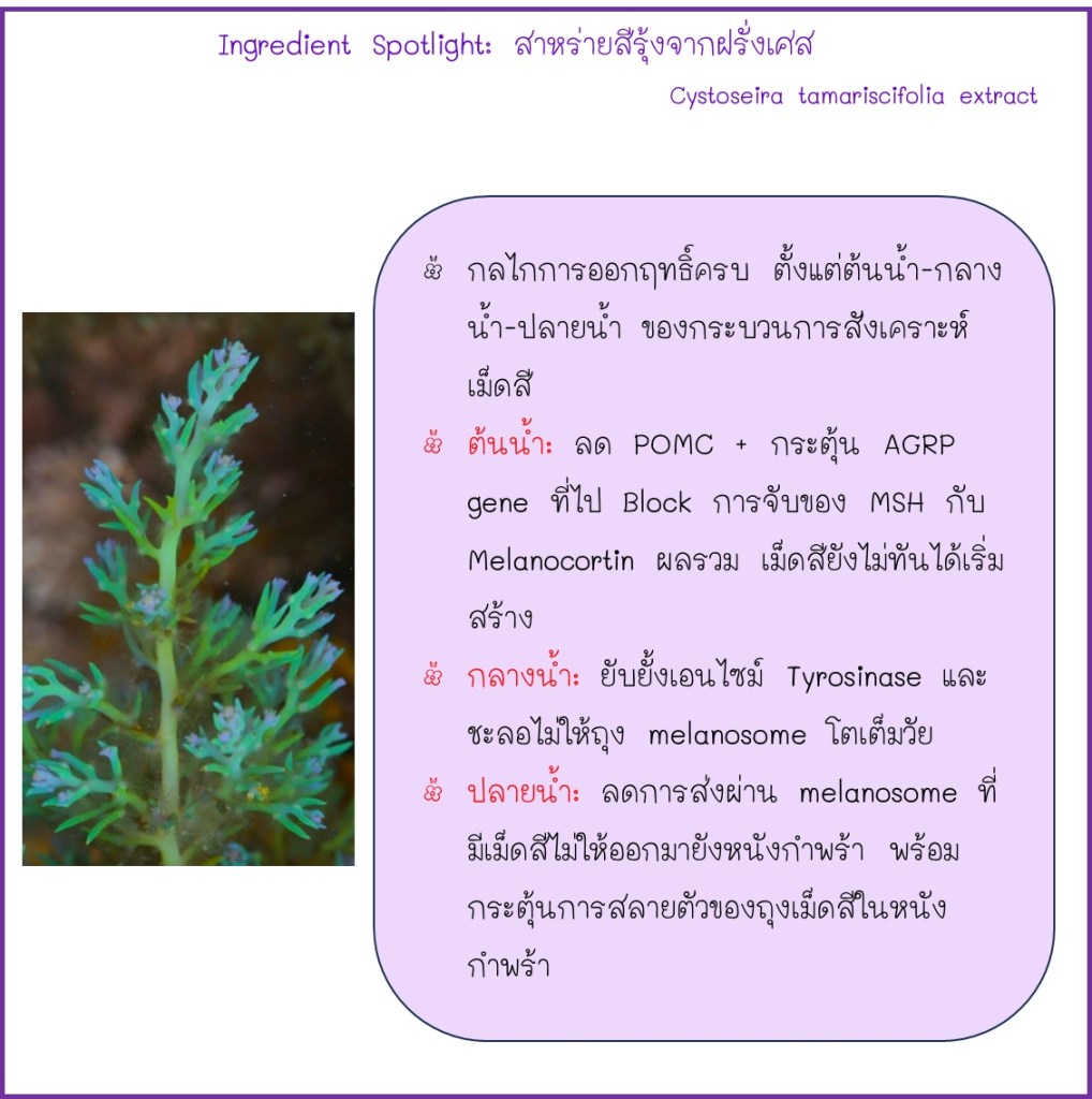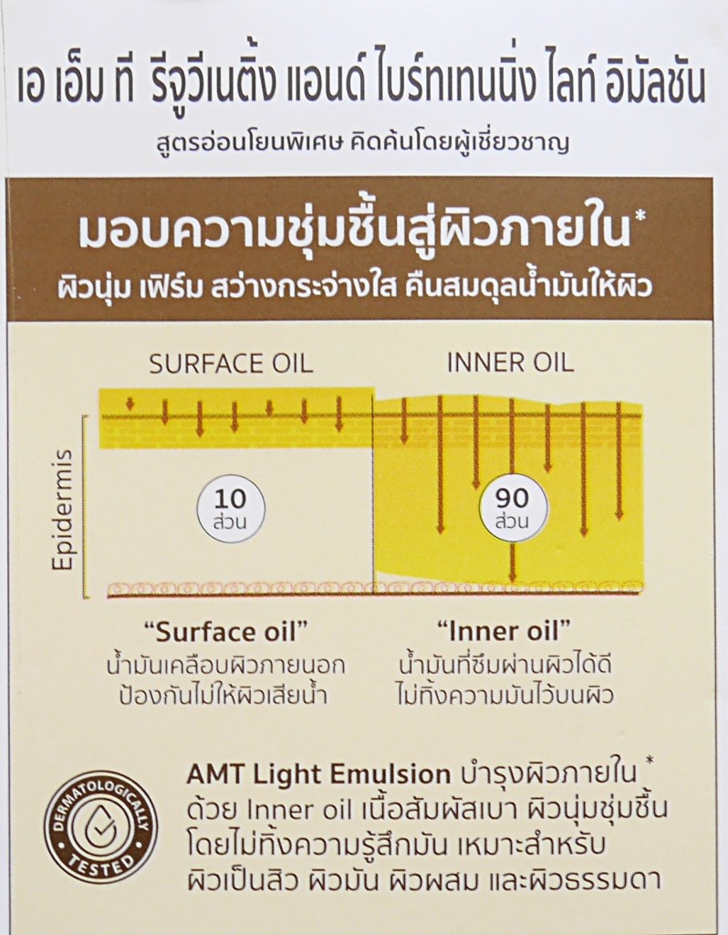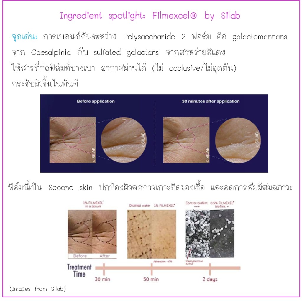 ในส่วนของ antioxidant มีการเสริมวิตามินอี ร่วมกับสารสกัดจากชาเขียว โรสแมรี่ และดูแลการระคายเคืองด้วยสารสกัดจาก cica, scutellaria, polygonum และชะเอม