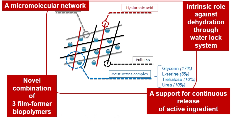 ในส่วนของการเติมน้ำ นอกจาก NMF แล้ว ยังเสริมมาด้วย Hyaluronic acid และอนุพันธ์หลากหลายฟอร์ม มากันทั้งตัวเล็กตัวใหญ่ ตัวเคลือบ ตัวเกาะ เพื่อเสริมกระบวนการเก็บน้ำให้ผิว