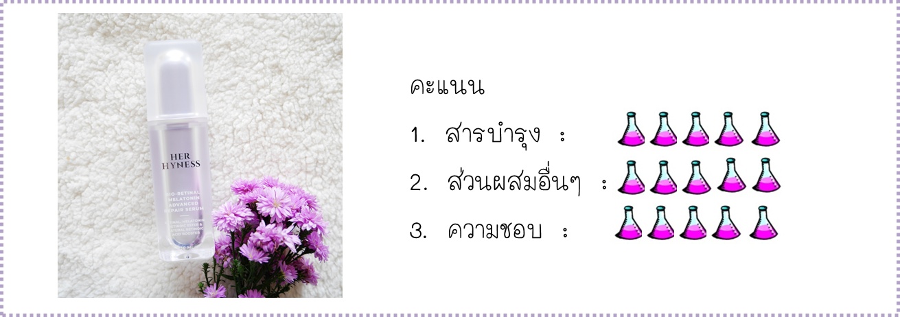 - ความชอบ ตัวเซรั่มมาในเนื้อที่บางเบาไม่หนักมาก เลเยอร์ลงรูทีนง่าย ในด้านของความชุ่มชื้น สำหรับคนผิวผสม-แห้ง อาจจะต้องมีครีมมาทับอีกชั้น ในด้านของการใช้งานส่วนตัวมองว่าเซรั่มนี้ทำมาได้ค่อนข้างดี ผิวนุ่มเนียนขึ้น และเป็นทางเลือกที่น่าสนใจสำหรับการใช้เซรั่มที่ไม่มีเรตินอยด์ ให้ไป 5 ฟลาสก์