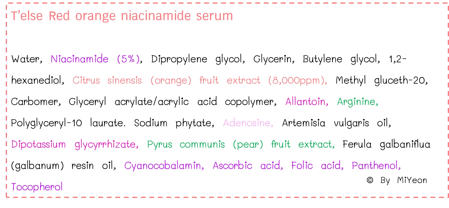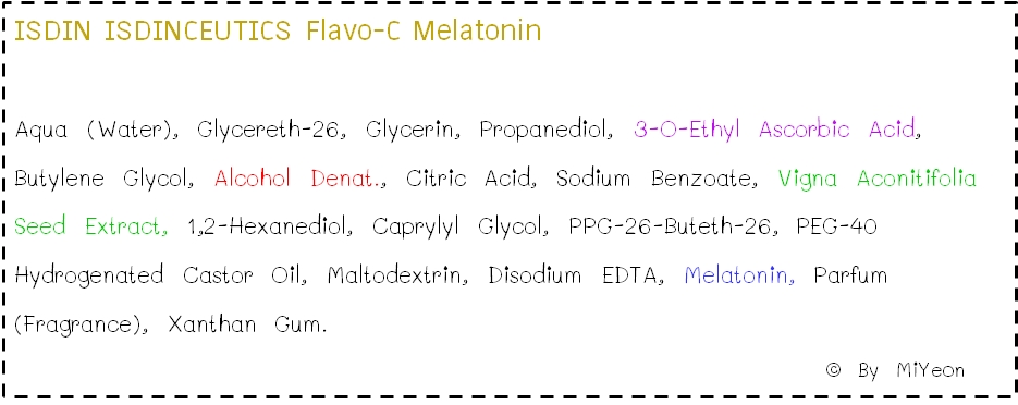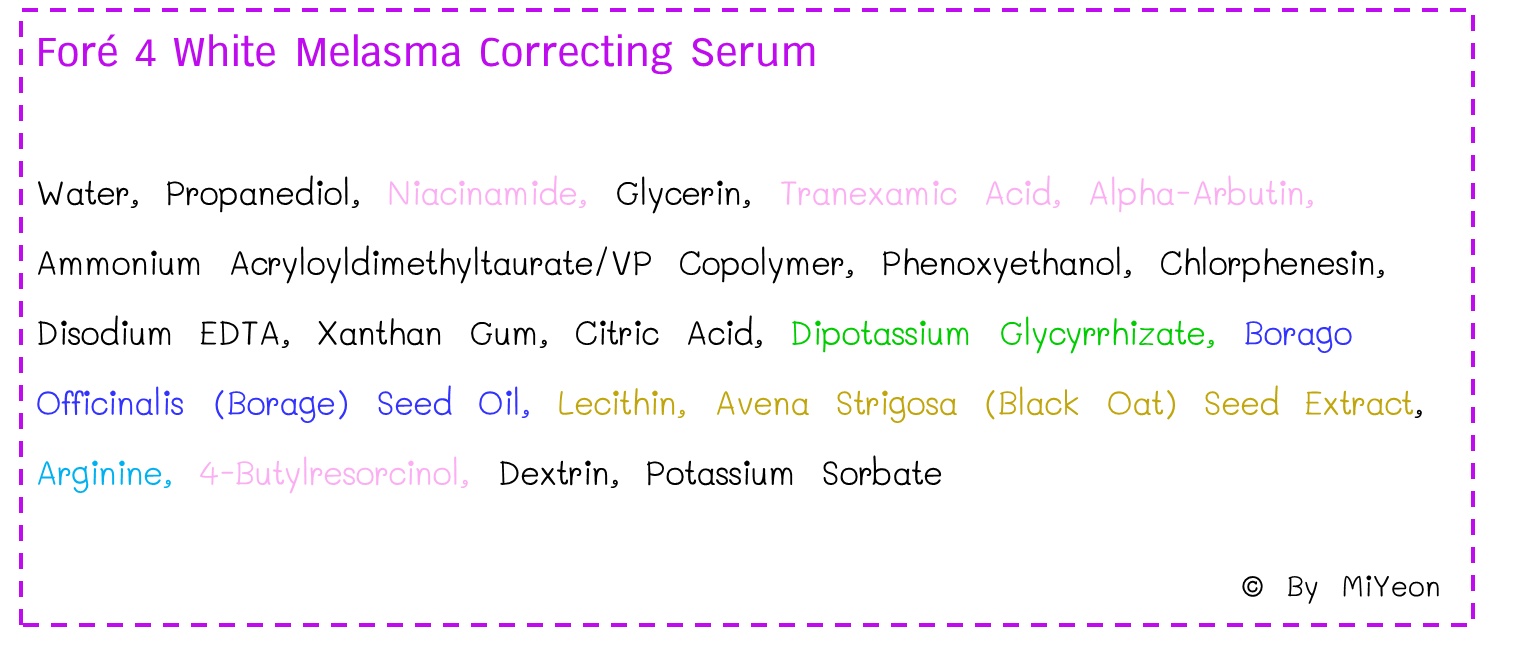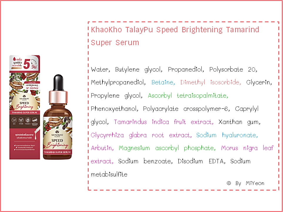 - Ascorbyl glucoside (AA2G) เป็นวิตามินซีฟอร์มที่ละลายน้ำได้ดี ความคงตัวดีทั้งต่ออุณหภูมิ และ ทน pH ได้ในช่วงกว้าง (Huang et al., Bioorg Med Chem Lett 2013;23(6):1583-1587.) ดูดซึมผ่านผิวได้ เมื่อลงผิวจะกลายร่างเป็น Ascorbic acid (AA) ได้ บางการศึกษาว่าการว่า AA2G มีฤทธิ์ยาวนานกว่า AA เพราะมาจากผิวเราค่อยๆ ตัด Glucose ออก ได้ AA มาทีละน้อยๆ ในด้านของประสิทธิภาพ นั้น มีผลการทดสอบในเซลล์เพาะเลี้ยงชนิดต่างๆ พบว่า AA2G มีคุณสมบัติเป็น Whitening โดยไปลดการสร้างเม็ดสี กระตุ้นการสังเคราะห์คอลลาเจน ประสิทธิภาพเหมือน LAA แต่ออกฤทธิ์ได้นานกว่า ปกป้องเซลล์ผิวจากรังสี UVB ได้ดีตามความเข้มข้นที่เพิ่มขึ้น (Dose dependent) และลดการอักเสบที่เกิดต่อเนื่องมาจากรังสี UV และ เป็น Antioxidant ที่ดี (Enescu et al., J Cosmet Dermatol. 2022;21:2349–2359; Kumano, et al., J Nutr Sci Vitaminol (Tokyo) 1998;44(3):345-359.) ซึ่งทางแบรนด์เคลมว่าใช้อยู่ที่ความเข้มข้น 3%