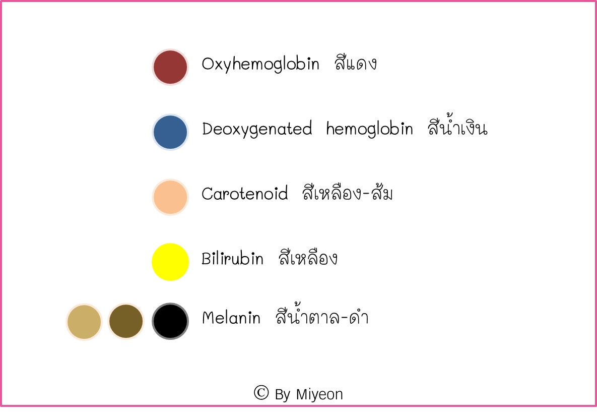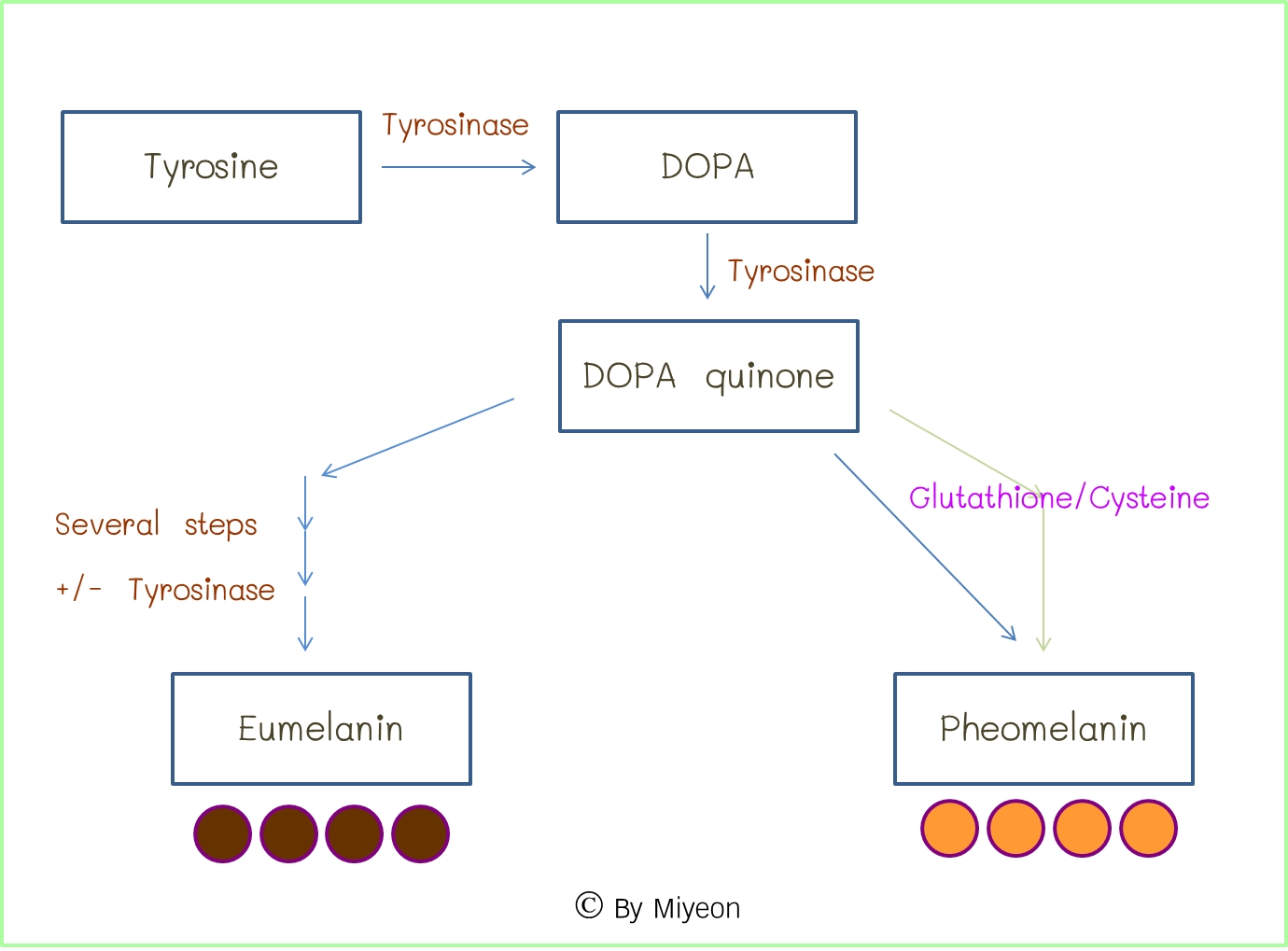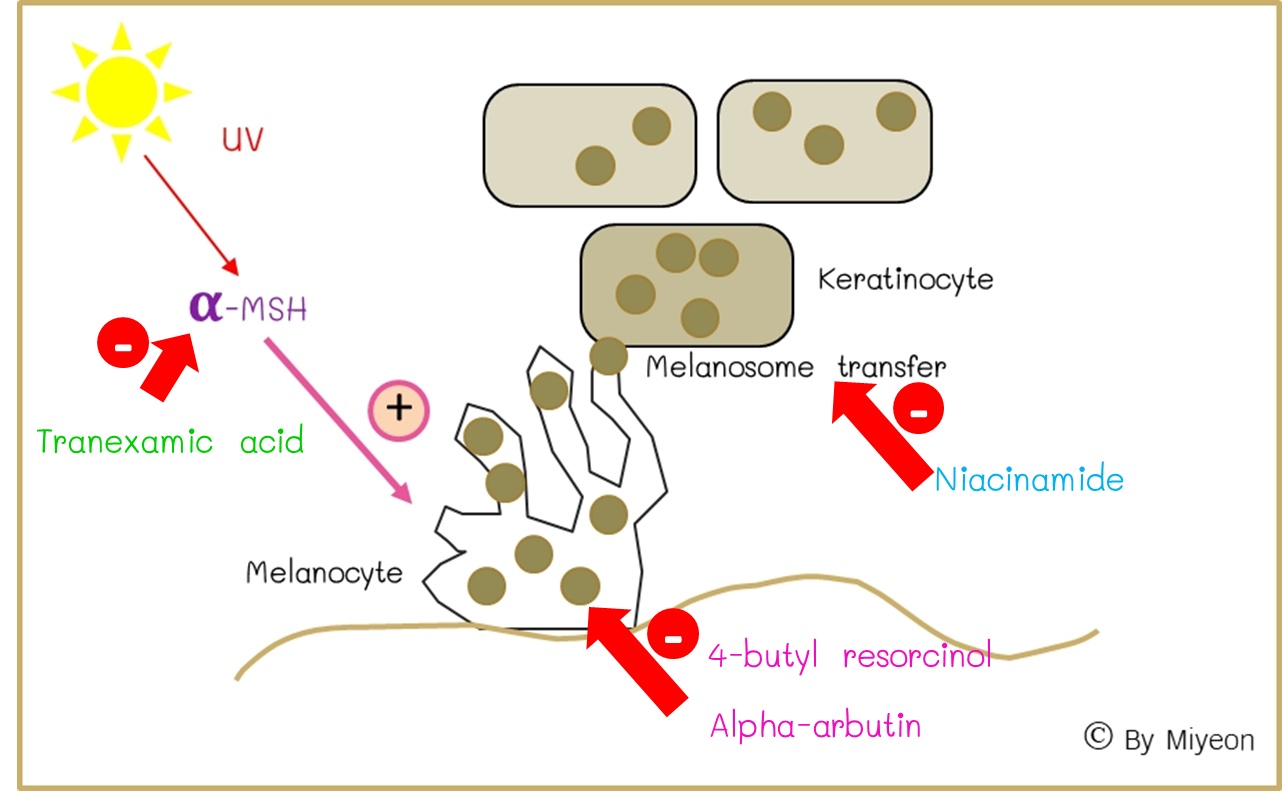 - กลางน้ำ: ยับยั้งเอนไซม์ Tyrosinase และชะลอไม่ให้ถุง melanosome ใน melanocyte เจริญจนเป็นถุงพร้อมส่งออกไปหนังกำพร้า