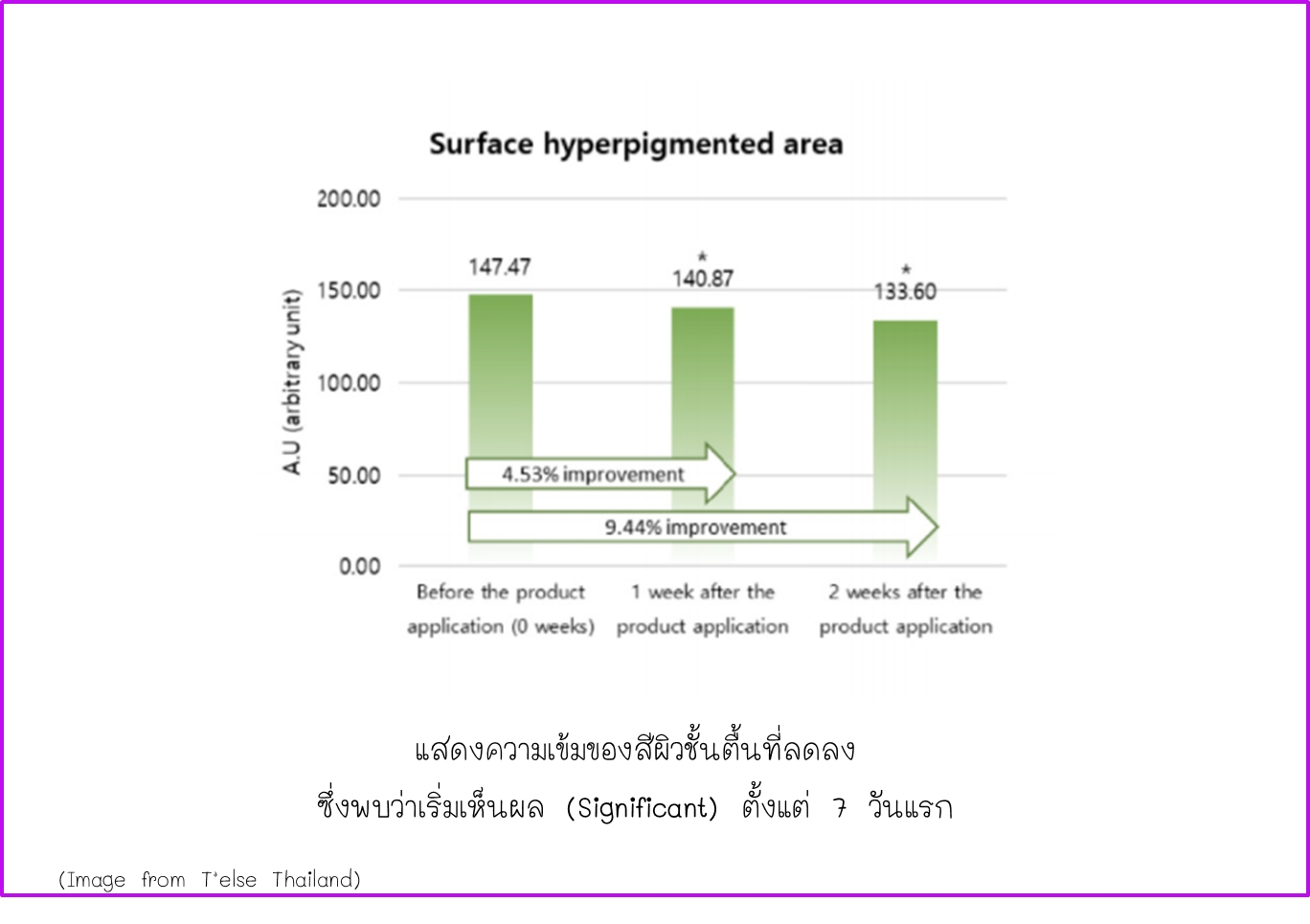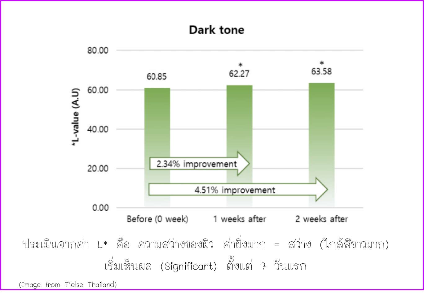 - 4 สัปดาห์ จุดด่างดำสีจางลง 11.5% และ สีผิวสม่ำเสมอมากขึ้น 24.5%