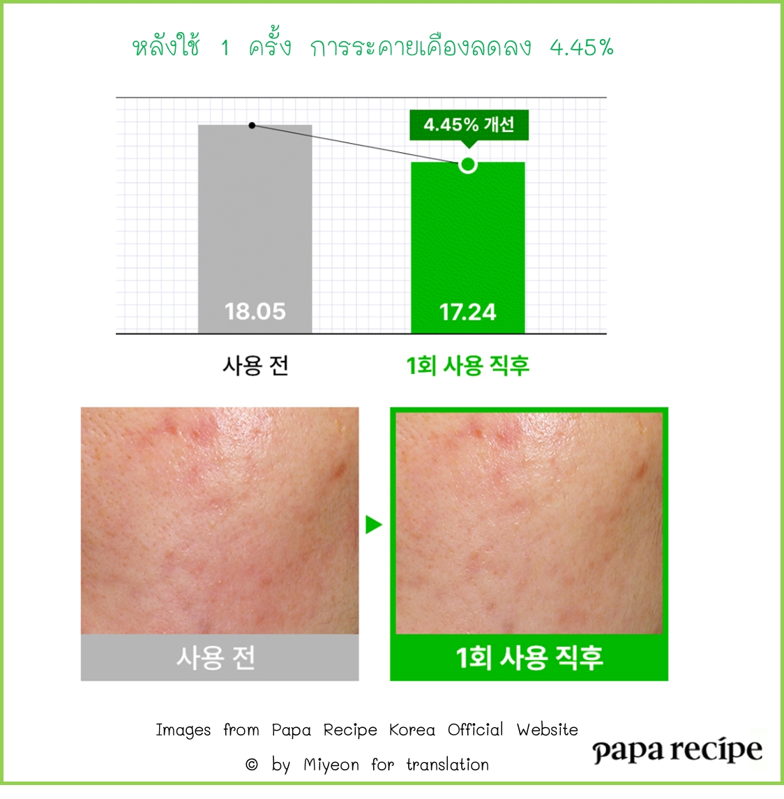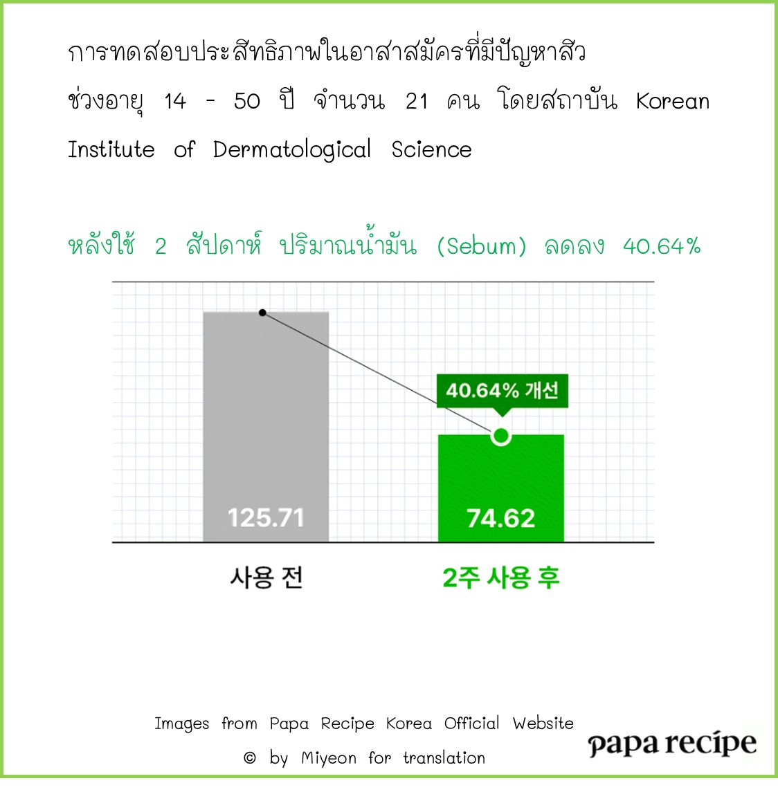 ที่น่าสนใจคือ เราใช้เวลา 1 เดือน ซื้ออายุผิวคืนได้ 1 ปี ตรงนี้เป็นอะไรที่ดีงามมากจริงๆ นอกจากนี้ค่าอื่นที่ดีขึ้น ได้แก่ ผิวเรียบเนียนขึ้น จุดด่างดำดีขึ้น อาการระคายเคือง (ประเมินจากรอยแดง) ลดลง และตัว Porphyrin ที่สร้างจาก C. acnes ลดลง